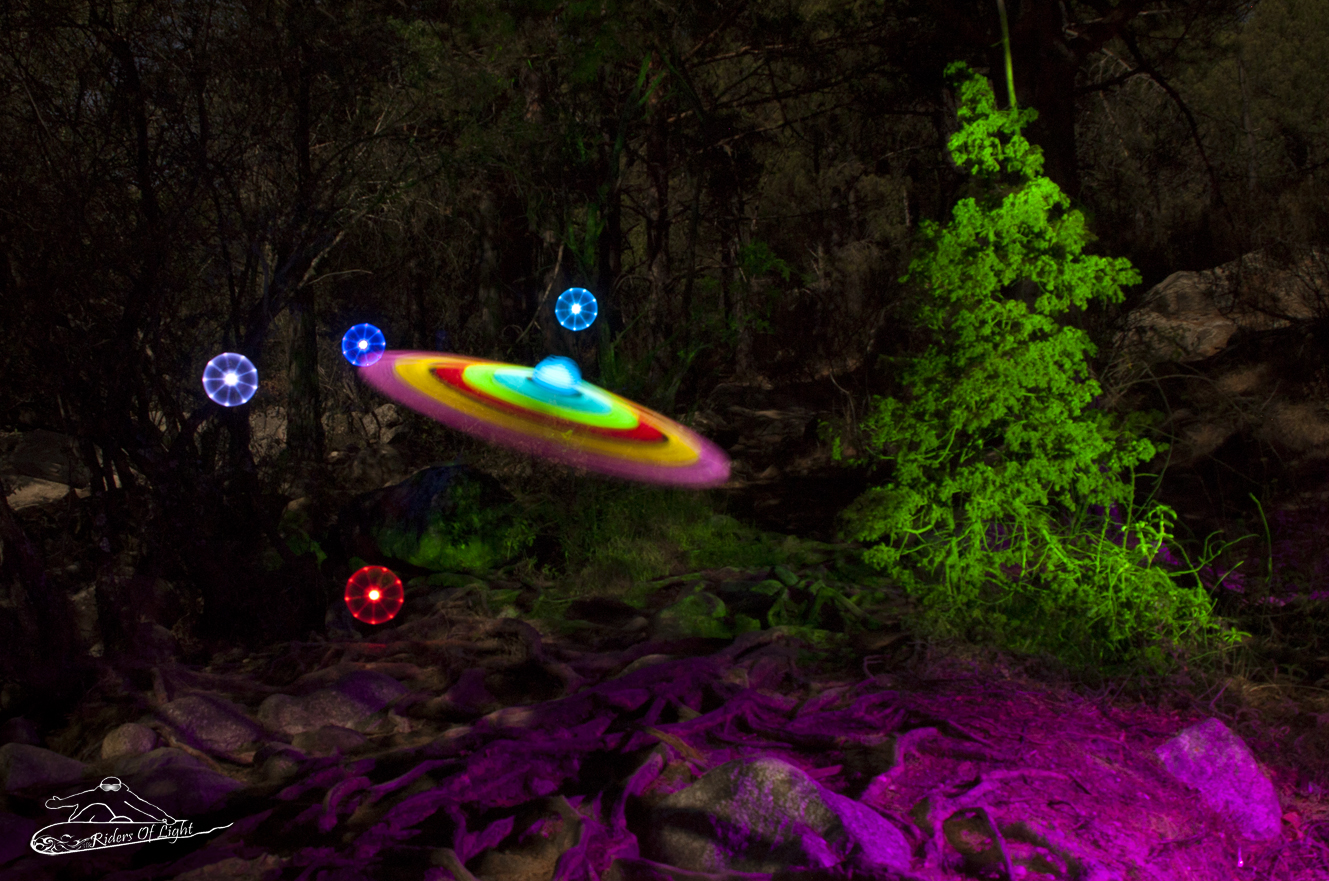 Fantástica sesión en plena naturaleza con buena compañía, buscábamos crear una escena de fantasía entre los arboles y la interesantes raíces del suelo, utilizamos flash filtrado para iluminar el suelo y linterna Led Lenser T7 para los arboles, el platillo volante lo creamos con una nueva herramienta de la que hemos creando un Making Of que podeis ver y por ultimo unas figuras circulares con led para darle un toque mágico al lugar.