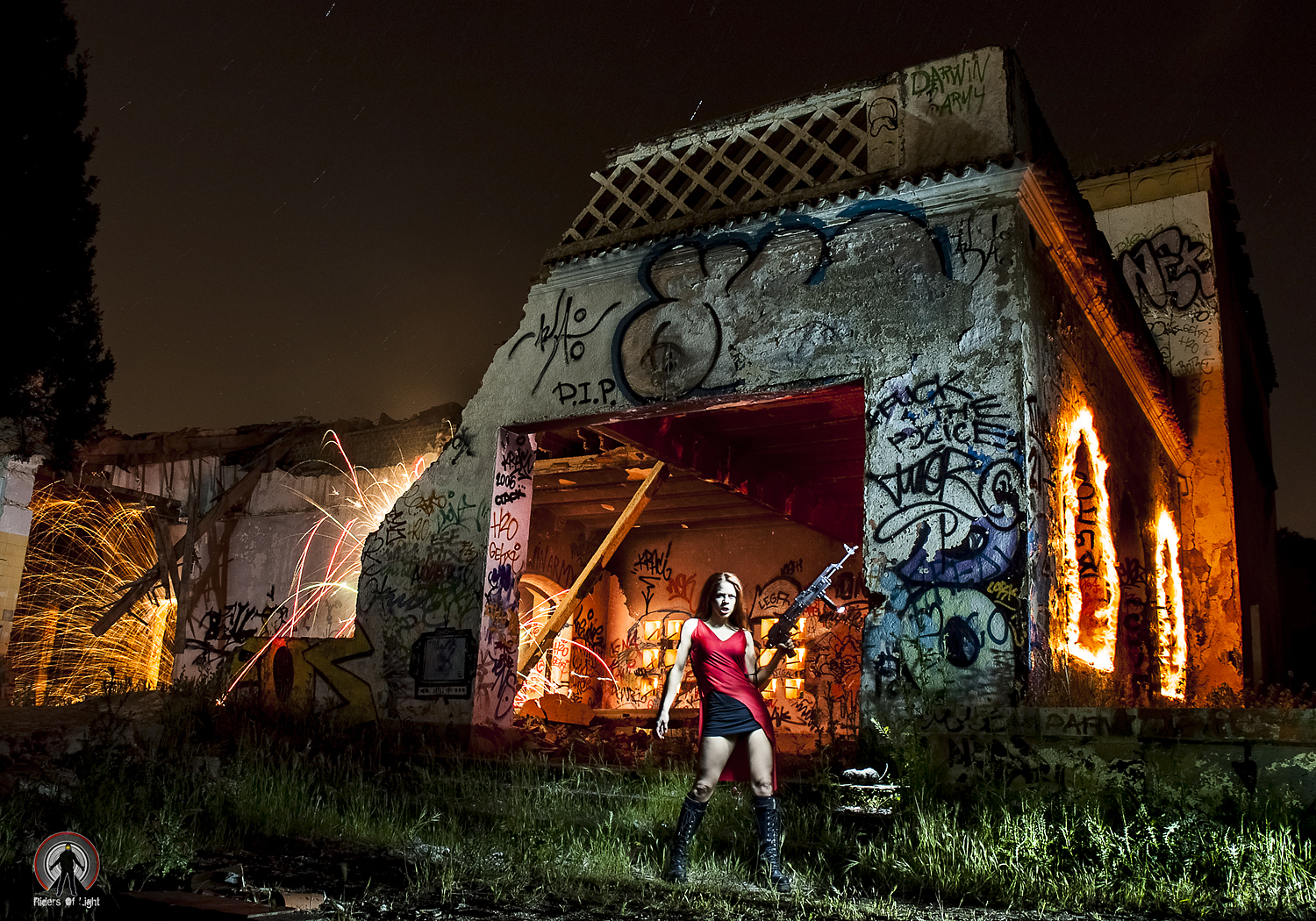 Tuvimos que cerrar diafragma a F11 + Iso 125 debido a la alta luminosidad de las pirotecnia y lana de acero , ello nos llevo a tener que utilizar linternas muy potentes para iluminar la escena de un modo rápido, usamos Led Lenser x21 para fachada y suelo y M7 para la modelo y la pequeña rata de la escalera.