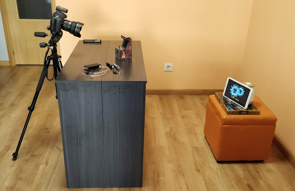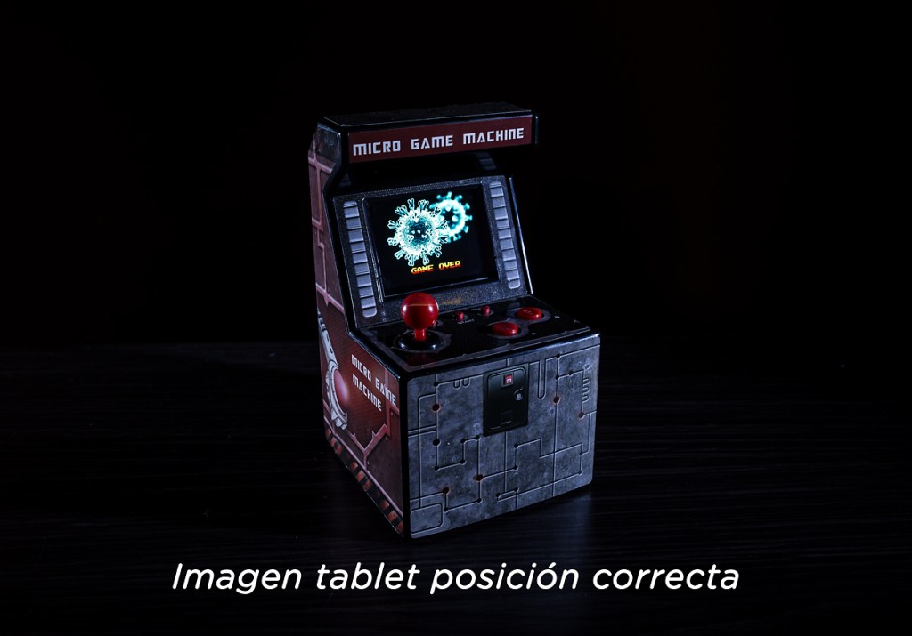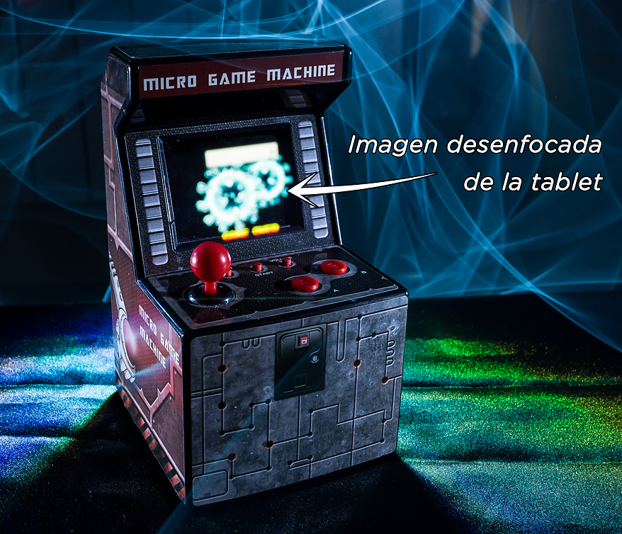 La fotografía no es complicada en cuanto a iluminación y efectos de luz, lo difícil fue cuadrar en tamaño, distancia y perspectiva la imagen de «Game Over» de la tablet (bastante más grande que la pantalla de la maquinita) para que apareciese en tamaño y posición correctas dentro de la pequeña pantalla de nuestra maquinita recreativa.