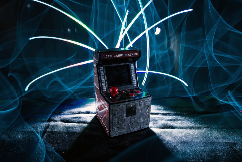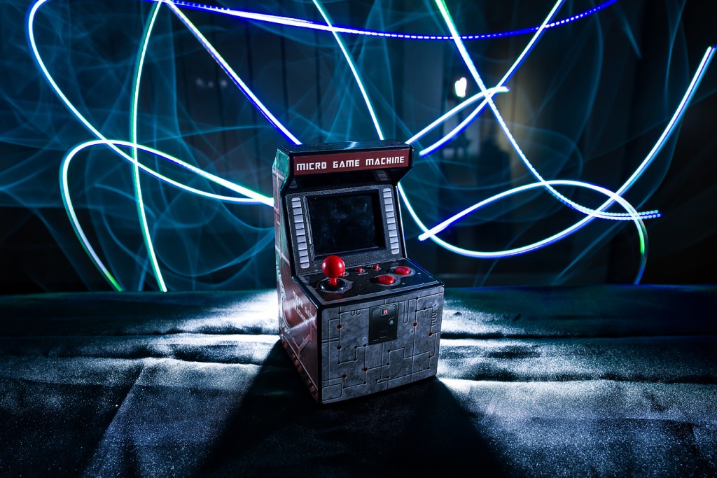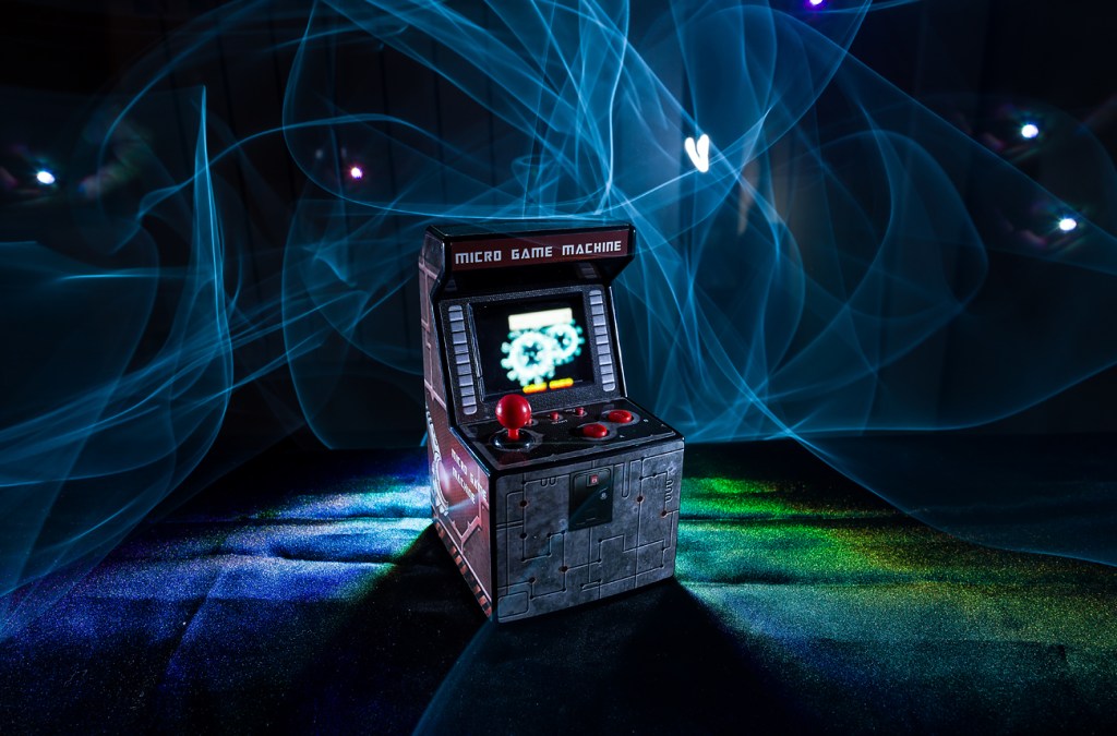 Para realizar esta fotografía la verdad es que contábamos con pocas herramientas, pero el reto de complicarla un poquito para poder meter una imagen justo en la pantalla de la maquinita nos atraía bastante.