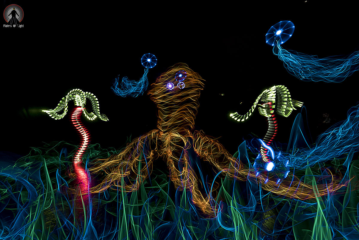 Antes de irnos aunque con poco tiempo pudimos sacar la cámara y jugar un poco con los hilos luminosos. Realizamos una fotografía en vivo creando un mundo submarino con nuestro pulpo wheke y nuestras medusas de luz.